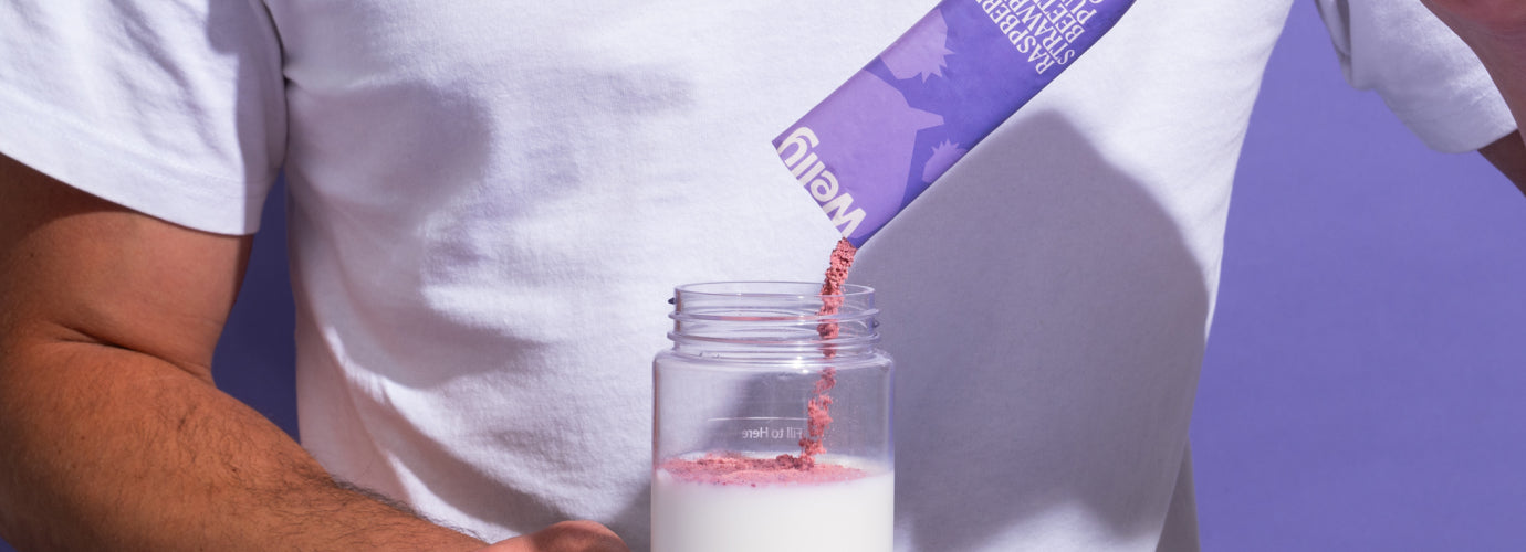 One Welly instant smoothie contains over half your daily intake of fruit + veg and supports daily wellbeing.