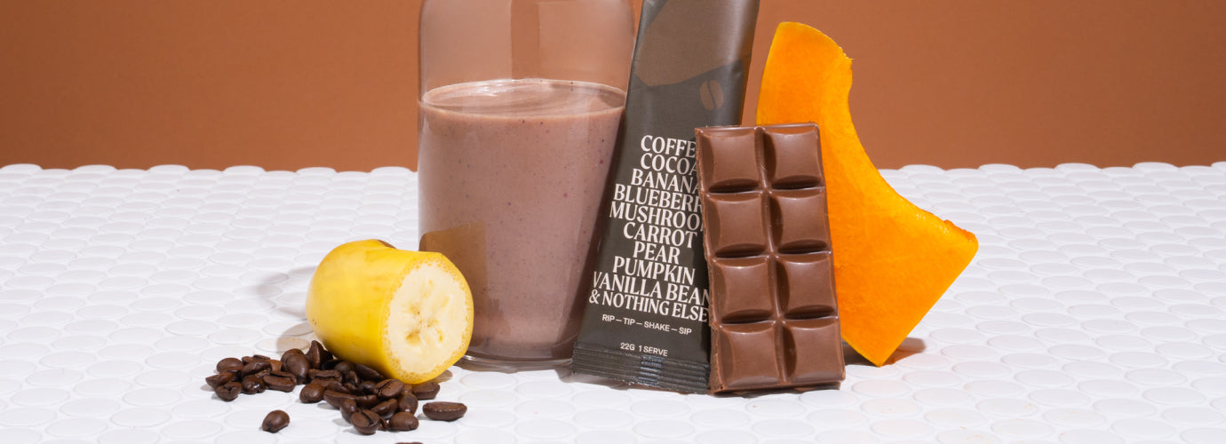 Pear (31%), Carrot (23%), Pumpkin (19%), Banana (13%), Cocoa (Cocoa Alkalised, Sunflower Lecithin)(6%), Coffee (5%), Blueberry (2%), Vanilla (1%), Mushroom (0.5%).